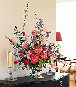 If you want to make quite an impression, this bouquet with its gorgeous pink and blue flowers, and footed container, will leave a lasting one.