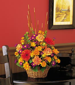 This beautiful basket filled with orange and purple flowers is topped with striking cattails. What splendor in the garden! Perfect for Thanksgiving.